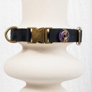 Κολάρο σκύλου με λίθο Αμέθυστου (μωβ) που μειώνει τη λαιμαργία και ενισχύει την πνευματική προστασία απέναντι στο φόβο.